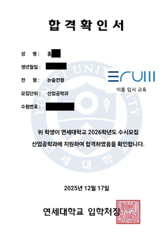 허나 김용석 선생님의 밀도 높은 수업, 매 시간 진행되는 테스트와 첨삭 지도 덕에 정말 비약적인 실력 발전을 이룰 수 있었습니다. 연세대학교 산업공학과 경희대 물리학과 교과성적 : 2.5 수능성적 : 3 2 3 4 4 논술 준비기간 : 8개월 저는 학교에서 개설된 논술 강좌를 통해 고3 4월경 논술을 처음 접하게 되었습니다. 내신과 모의고사 성적 모두 만족스럽지 못했지만, 수학만큼은 자신이 있었기에 논술 전형에 도전하였습니다. 생소한 문제 유형에 어려움을 느끼기도 했지만, 김용석 선생님의 수업을 통해 이를 극복해내고 좋은 결과 얻을 수 있었던 것 같습니다. 저에겐 논술 시험의 유형이 굉장히 생소했고, 기하 과목의 경우 배경지식도 전....... <img src="https://blogthumb.pstatic.net/MjAyNjAxMTFfMjcw/MDAxNzY4MDgyNTkxNzA4.qRvy2nvBiEhUiFkB5ytiCDIvvXMrQ5PZiPjTN4d1Jn4g.23qkRVzOK6Mn8meGx1hKCIFoOLvpsc9kWJQOtNcUe8cg.JPEG/2026%C7%D0%B3%E2%B5%B5%BF%AC%BC%BC%B4%EB%BC%F6%B8%AE%B3%ED%BC%FA%C7%D5%B0%DD%C1%F5%BA%D0%B4%E7%C0%CC%B7%EB%B3%ED%BC%FA%C7%D0%BF%F8%C0%CC%B7%EB%C0%D4%BD%C3%B1%B3%C0%B0.jpg?type=s3" />