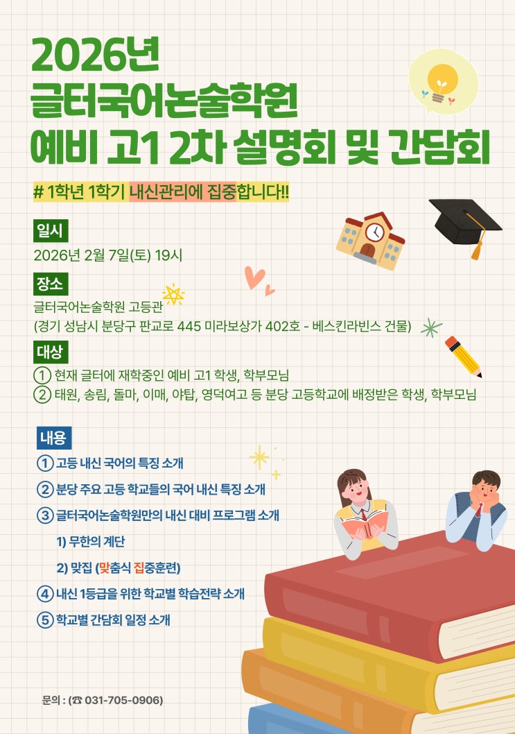 2026년 글터국어논술학원 예비 고1 2차 설명회 및 간담회 안녕하세요, 글터국어논술학원입니다. 다가오는 2026년 2월 7일(토) 19시, 예비 고1 학부모님들을 대상으로 2차 설명회 및 간담회를 진행합니다. 일시 : 2026년 2월 7일(토) 19시 강사: 유영대 선생님, 김소윤 선생님 장소 : 글터국어논술학원 고등관 (경기 성남시 분당구 판교로 445 미라보상가 402호 - 베스킨라빈스 건물) 프로그램 안내 ① 고등 내신 국어의 특징 소개 ② 분당 주요 고등 학교들의 국어 내신 특징 소개 ③ 글터국어논술학원만의 내신 대비 프로그램 소개 1) 무한의 계단 2) 맞집 (맞춤식 집중훈련) ④ 내신 1등급을 위한 학교별 학습전략 소개 ⑤ 학교별 간담회....... <img src="https://blogthumb.pstatic.net/MjAyNjAyMDFfMTE3/MDAxNzY5OTQzMDQwMjc0.z6iTzfXs_KX2w7-Ap1HdzptmiXTNDTeJgpTYS-L-QGgg.PPbkq5x9NtScDRc7qLBFTTrN28BnAip6x1cpaiyMki0g.JPEG/%B0%ED%B5%EE_%BC%B3%B8%ED%C8%B8.jpg?type=s3" />