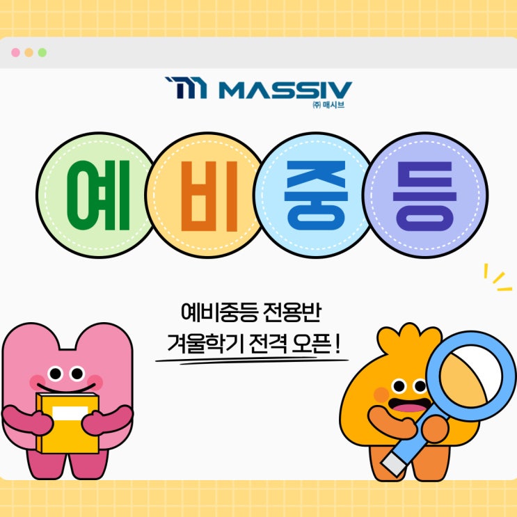 매시브 중등영어 안녕하세요. 매시브 학원입니다 벌써 12월이 다가면서 올해가 끝나가는 중이네요 ~! 올해를 보내주며, 내년을 맞이 할 준비도 같이해야하는거 아시죠 ~? 그런 의미로 ! 내년 2026 예비중등 전용반 겨울학기 전격 오픈입니다 :) 예비초6~예비중1 (예비중등) 학생들은 수강가능합니다 ! * 수강 전 레벨테스트 응시는 필수 ! ! ! 예비중등 전용반은 강사팀, 관리팀에서 밀착 관리 할 예정입니다 ! 어법서술형, 독해 각각 하나의 반씩 선택하여 주 2회 수강 아이의 취약한 부분만 듣고 싶다면 주 1회 도 수강가능합니다. 수업시간은 총 3시간 입니다 ! 1시간 : 단어테스트 및 복습테스트 (목요일 독해 수업은 주 1회 듣기테스트 포함....... <img src="https://blogthumb.pstatic.net/MjAyNTEyMTFfMTc2/MDAxNzY1NDM5MTM0ODYz.6eUouSBKgcag3IHGvQ03TcX084M-EkbT4WxGxR8HVfEg.sV3xy2zLJQAx8pBDlH-iPUTjQh-8NfmwcDYiueld4Usg.JPEG/%BA%D0%B4%E7-%BF%B9%BA%F1%C1%DF%B5%EE_%BA%B9%BB%E7%BA%BB-001.jpg?type=s3" />