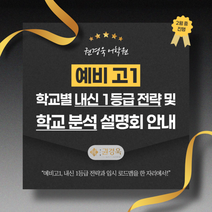 안녕하세요~^^ 의정부에서만 17년 이상, 최상위권의 이유있는 선택! 본질적 영어 실력과 단단한 학습 습관을 함께 만들어가는 영어전문 교육, 권경욱 어학원입니다. 오는 2026년 2월, 저희 권경욱 어학원에서 예비 고1 학부모님과 학생을 대상으로 『학교별 내신 1등급 전략 및 학교 분석 설명회』를 진행합니다. 학교별, 학년별 맞춤 정보를 통해 내신 관리와 입시 전략을 한눈에 확인할 수 있는 기회입니다. 2월 설명회는 각 학교별로 나누어 진행될 예정이며, 자세한 학교 및 일정은 위 표를 참고해 주시면 됩니다! 설명회에서는 해당 학교 최근 3개년 대학 진학률, 교과서 출판사, 학사 일정 등 핵심 정보를 분석하고, 내신 관리 및....... <img src="https://blogthumb.pstatic.net/MjAyNjAxMjZfNjAg/MDAxNzY5Mzk5Nzc1ODg2.NSpyKrUJSf1C9LuGXAupB5opT5nxlK3nvnLFXbaasgIg.3iMa7iMliS57KPyzQdS2diPZEApcx3aH8uo606hN-vkg.PNG/%BD%C5%B0%EE%B5%BF_%BF%B5%BE%EE%C7%D0%BF%F8-001_%282%29.png?type=s3" />