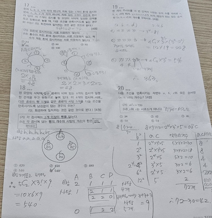 안녕하세요? 획률과 통계 중간고사 대비겸 3월 모의고사 대비합니다. 23년~25넌 확통 24문제를 다뤄봤는데요. 그중 복잡한 몇 문제를 정리했습니다. 획통중 가장 어려운게 경우의 수인데 공식보다는 경우를 나눠서 풀어야 하는 문제들이 있어요. 문제가 복잡할수록 문제를 끊어 읽고 그 단서를 찾아 그림을 그리면 됩니다. 함수는 케이스를 따져서 구해야되요. 열심히 풀면 안 틀리는게 확통이에요. 확통 내신반과 수능 정시반 모집중입니다. 언제든 상담이 필요하면 연락주세요. <img src="https://blogthumb.pstatic.net/MjAyNjAzMThfMjk0/MDAxNzczODE0MDg4OTI2.eDtFyRecx2-uzy2R6Yc85jK8Bqfx3paobyHe6UdGzJkg.UohvsPZhgkxUFR74_TBYPWIUQpYjPcydgly8chfzYsog.JPEG/1773813783887.jpg?type=s3" />