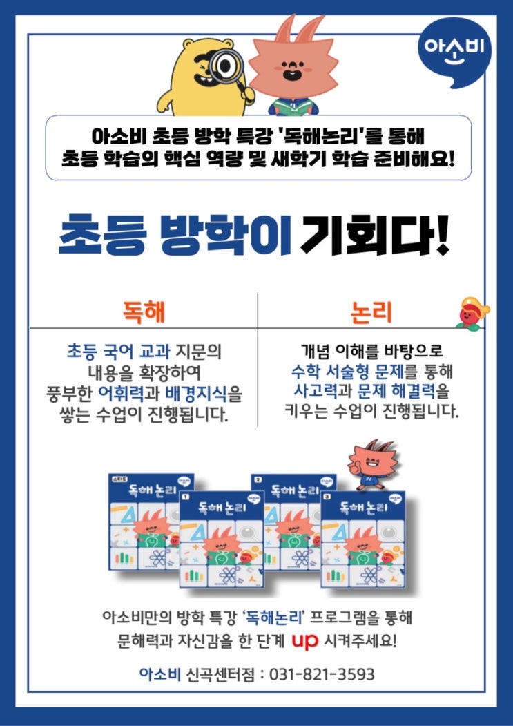 안녕하세요! (유치•초등 전문 학원) 아소비 신곡센터점입니다. 초등 방학 특강 프로그램 ‘독해논리’ 수업 안내 드립니다. 아소비에서만 경험할 수 있는 방학 프로그램 독해논리 수업을 통해 방학을 특별하게 보내세요! 독해 프로그램 (국어) 문학, 사회, 과학, 역사 등 초등 국어 교과 지문의 내용을 확장하여 문해력과 어휘력, 배경지식을 쌓습니다. 다양한 영역의 지문을 경험하며 깊이 있게 이해하고 사고하도록 도와줍니다. 확장된 배경지식과 독해력으로 글을 읽고 내용을 체계적으로 이해 합니다. 논리 프로그램 (수학) 수와 연산, 도형, 규칙 등 다양한 분야의 수학 서술형 문제를 통해 논리적 사고력과 문제 해결력을 키워줍니다. 수....... <img src="https://blogthumb.pstatic.net/MjAyNjAxMDdfMTQ5/MDAxNzY3NzE1MjU2NDQ3.vVffuhE52U5aCOA3PynnyhIy-qCr0ENNPT_6ZwvNRowg.Du6xTPTOmfvZjD0SXp_8LMwxvI7fOxXr10q43QfmDM4g.JPEG/BC0ED27B%A3%ADE11F%A3%AD48A4%A3%AD8B96%A3%AD8B212B5209CE.jpeg?type=s3" />