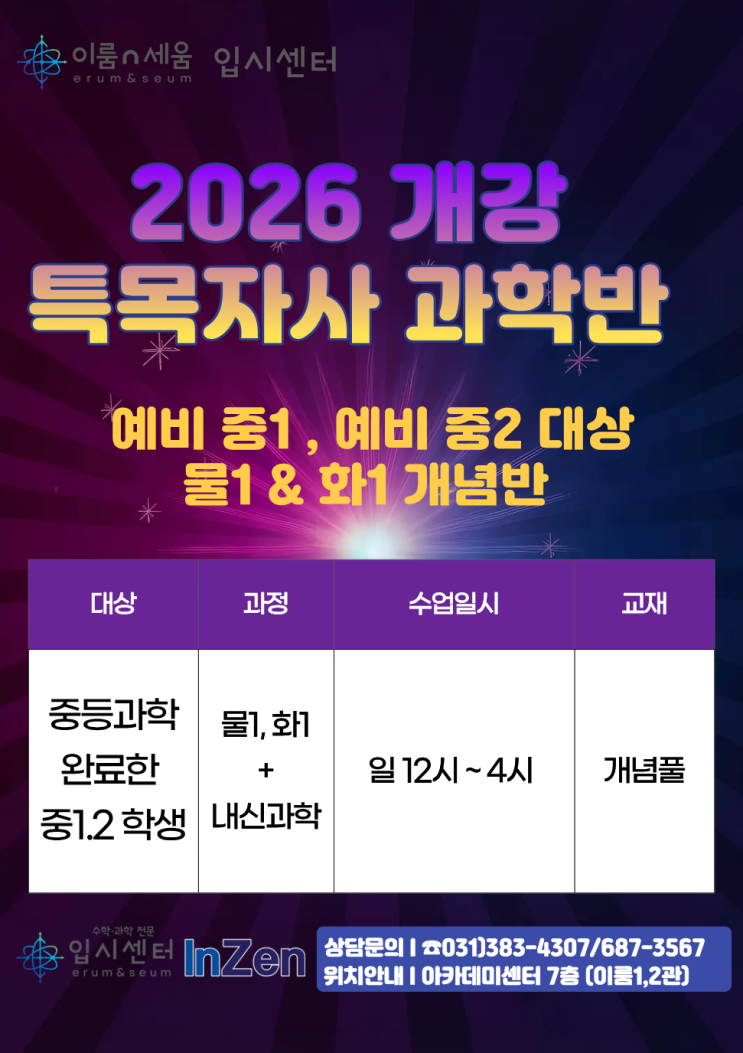 [이룸앤세움 입시센터] 특목 자사 대비 과학반 (물리1+화학1) 개강 안내