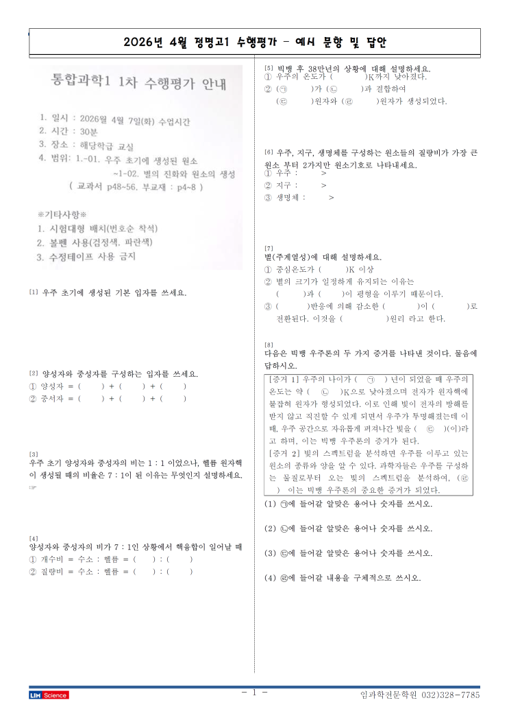 2026년 4월 정명고1 수행평가 – 예시 문항 및 답안