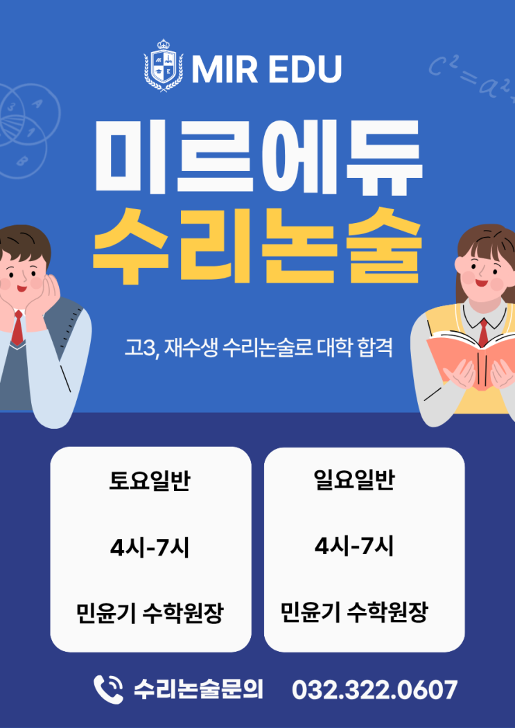 부천 상동·중동, 그리고 인천 지역에서 수리논술을 제대로 준비할 수 있는 수업을 찾고 계신다면 이번 개강반은 한 번은 꼭 확인해보셔야 합니다. 미르에듀 수학에서 운영하는 수리논술반은 기존 토요일 반에 이어, 일요일 반까지 새롭게 개설됩니다. 수업은 모두 민윤기 수학원장이 직접 진행합니다. 주 1회, 3시간 수업으로 구성되어 있으며 토요일 또는 일요일 중 선택해서 수강할 수 있습니다. 수리논술, 왜 따로 준비해야 할까요 수리논술은 일반적인 수능 수학과는 접근 방식이 다릅니다. 문제를 맞추는 것보다 어떻게 생각했고, 어떻게 전개했는지를 논리적으로 서술하는 것이 핵심입니다. 그래서 단순 문제풀이 강의로는 실제 시험에서 점....... <img src="https://blogthumb.pstatic.net/MjAyNjA0MDNfMTky/MDAxNzc1MjE2MzQ1MjQw.dVPJkn_APIvj4T8yjezBk5UnKen7zFmp6jBOUdBsTx8g.kfCJfgSXbXJbSu8hKqLPFlp26cUhsS7ipiR0EuPYetQg.PNG/%C1%A6%B8%F1%C0%BB_%C0%D4%B7%C2%C7%D8%C1%D6%BC%BC%BF%E4._%2847%29.png?type=s3" />