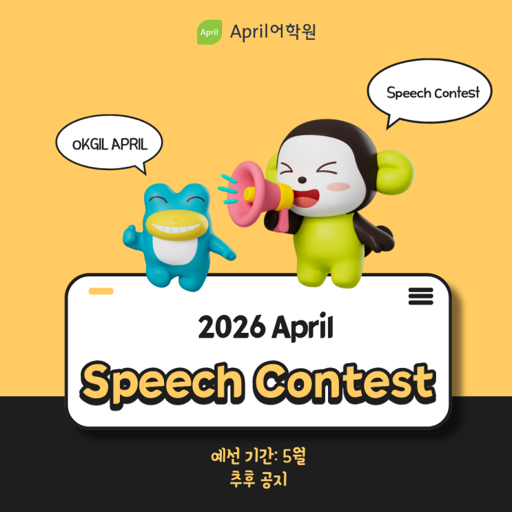 안녕하세요, 옥길 에이프릴입니다 아이들이 가장 기다리는 이벤트 중 하나! 2026 April Speech Contest가 곧 시작됩니다! Speech Contest 란? 아이들이 영어로 자신의 생각을 표현하고, 무대 위에서 자신감을 키울 수 있는 특별한 기회입니다. 레벨별 주제 미리보기! ① Phonics Starter ~ Seed: April Song + 자유곡 (총 2곡) ② Sprout 1~3: One Rule I would Change at School (우리 학교에서 바꾸고 싶은 규칙 1가지) ③ Sapling 1~2: The Most Important Decision I have made (내가 내린 가장 중요한 결정) ④ Junior Master 1~2: How Kids can help their Community (아이들이 공동체를 도울 수 있는 방법) 일정 1차 예선 (5월 추후....... <img src="https://blogthumb.pstatic.net/MjAyNjA0MDZfMTMg/MDAxNzc1NDYxODM0MTIy.TC45NJdzpztVS5tnFlNMPMfQKf8KQeCmKyolV0aBpsYg.ajN9_lVXKVy8k4IgEIZ7cEUIDf1SPPPT7LaufRmpl9cg.PNG/1.png?type=s3" />