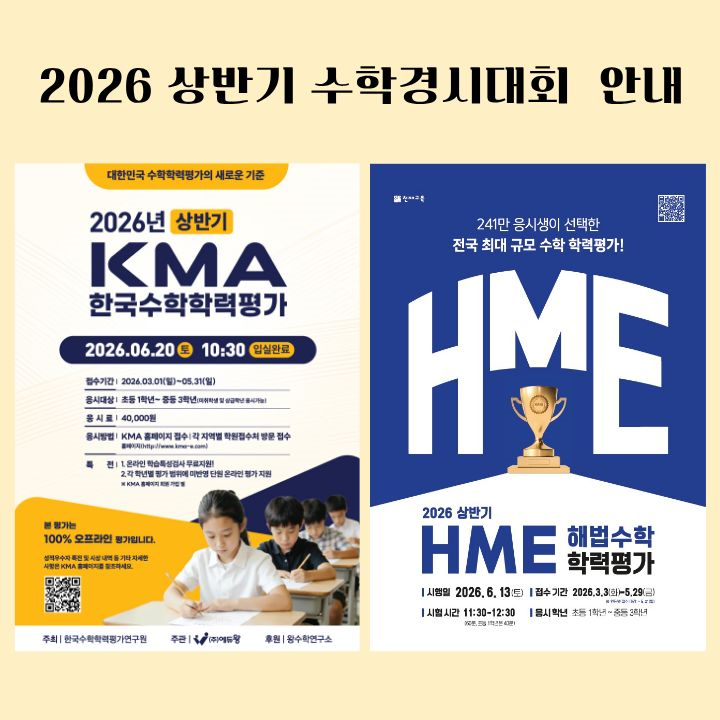 2026 상반기 수학경시대회 안내 (HME vs KMA) 안녕하세요 오정동 TOPMAX+영수학원입니다. 다가오는 2026년 상반기 수학경시대회를 앞두고 많은 학부모님들께서 문의를 주고 계십니다. 특히 가장 많이 받는 질문이 바로 이거예요. “HME랑 KMA 중 뭐가 더 좋나요?” “우리 아이는 어디부터 시작하는 게 맞을까요?” 그래서 오늘은 두 시험을 정확하게 비교해드리고, 우리 학원에서 어떻게 준비할 수 있는지도 함께 안내드리겠습니다 HME는 교과 기반 시험이라 학교 공부를 성실히 한 학생이라면 충분히 도전할 수 있는 구조입니다. 그래서 첫 경시대회로 가장 많이 추천드리는 시험입니다. 반면 KMA는 단순 계산이 아니....... <img src="https://blogthumb.pstatic.net/MjAyNjA0MDdfMjc5/MDAxNzc1NTY1OTkzMjg0.SH51cYeKFI4X1mZsW9p68N-VtQ0KK_mpY7rbZxPcl_4g.GoIzQvcT3sjVQS8OHHGWdZrUz0kapr5ap7zmmtxS5Dwg.PNG/KakaoTalk_20260407_144122575.png?type=s3" />