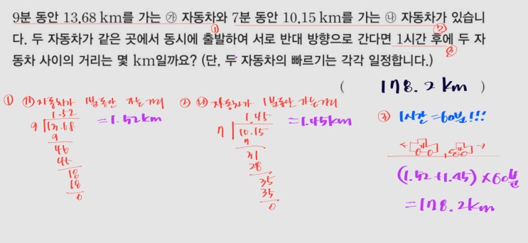 부천 목동썬수학입니다! 4월입니다. 이제 초등학생도 단원평가도 진행될 시기가 됐죠? 오늘은 소수의 나눗셈 문제를 풀어보겠습니다. 숫자만 보고 무작정 나누기보단 문제를 읽어보고 어떤 활용으로 문제가 출제되고 어떻게 푸는지 잘 읽어가면서 풀어봅시다. '같은 곳' '동시에' 문제 읽으면서 잘 봐야 합니다. 그리고 단위시간(1시간, 1분, 1초 등)에 움직인 거리를 찾아야 합니다 속력이라는 말을 알지 못해도 충분히 찾을 수 있습니다. 반대 방향으로 간다고 했죠? 그러니까 두 사람은 점점 멀어집니다. 두 사람이 이동한 거리를 더해 줘야 합니다. 수학 문제는 스스로 풀어낼 줄 알아야 합니다. 부천 목동썬수학입니다....... <img src="https://blogthumb.pstatic.net/MjAyNjA0MDdfNDQg/MDAxNzc1NTM4MjE1Mjgz.lF28MwhzDhDqumJibY6fP8x-FH7bQR8n47DZlUprZFIg.6INlW2RyGZUAldsdtJZ8ryXTBiHj1MT-7MFOeci1q4Yg.JPEG/%C3%CA6-1-%BC%D2%BC%F6%C0%C7%B3%AA%B4%B0%BC%C0.jpg?type=s3" />