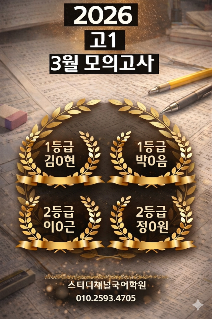 3월 24일 드디어 고등학교 첫 시험인 2026 고1 3월 모의고사가 시행 됐습니다. 이번 시험에서 의미 있는 결과들이 이어졌습니다. 먼저, 김○현 학생은 소사고 전교 1등을 기록했습니다. 단순한 1등급이 아니라, 학교 전체에서 가장 높은 점수라는 점에서 분명한 차이가 있습니다. 박○음 학생 역시 1등급을 기록하며 안정적인 상위권 실력을 보여주었고, 이○근, 정○원 학생도 각각 2등급을 받으며 확실한 상승 흐름을 만들어냈습니다. 특히 이0근 학생은 1등급(86점)에 1점 모자른 85점 2등급이라 아쉬움도 있었지만 가장 높은 곳을 향한 가능성을 본 시험이라 의미 있었습니다. 정0원 학생은 예비고 내내 어려워 했던 독서에서 좋은 성적을 만....... <img src="https://blogthumb.pstatic.net/MjAyNjAzMzFfMjc2/MDAxNzc0OTY1MjgyNjM5.VpKm-_iCuO3r0e168LHTq1XbDoxNoM0pPataioRHlggg.Em1erQhqvgtgfwwJehUX7c9BVzLbGMKnonvzRjNTMq8g.PNG/1774965226702.png?type=s3" />