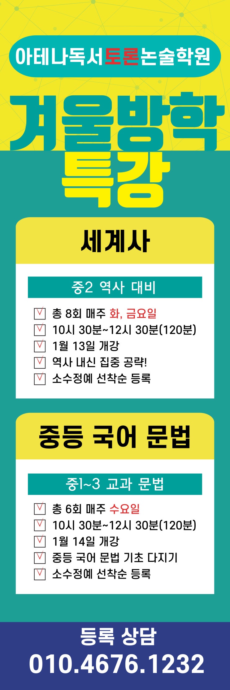 문자나 전화로 문의주시면 자세하게 안내 도와드리겠습니다. 긴 겨울방학을 알차게 보내는 가장 효과적인 방법! 아테나 독서토론논술학원 특강과 함께~ <img src="https://blogthumb.pstatic.net/MjAyNjAxMDVfMTE1/MDAxNzY3NTg1MjYxMjMz.Eh5zAtha4Pvwy8B9-XLFsSmU8Rk8w9jVNz1qF49TOK8g._DC1D419MZ6IUvOSF2WFmMWCNKVGxZAVeTlqsBc0iTIg.JPEG/26-%B0%DC%BF%EF%B9%E6%C7%D0-%C6%AF%B0%AD-001_%281%29.jpg?type=s3" />