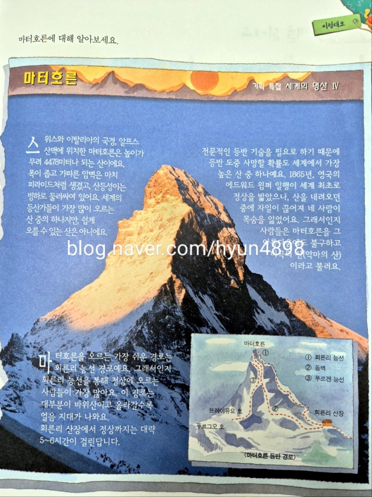 솔루니 독서논술 1월 C단계 《구늘 위를 오른 아이》 여덟 살의 어린 나이에 알프스의 준봉인 마터호른을 정복하여 세계를 놀라게 한 김영식 군의 실화를 바탕으로 쓴 동화입니다. 혹독하고 엄격한 훈련 과정, 정상에 오르기까지의 시련, 동사의 위험까지 각오해야 했던 험난한 하산의 과정 등이 아름다운 자연과 함께 펼쳐져 있습니다. 실화를 바탕으로 썼기 때문에 생생한 장면 묘사와 흥미로운 이야기 전개가 돋보이며, 아이들이 도전을 꿈꿀 수 있게 합니다. '왜 사람들은 힘들어하면서도 산에 오르는 걸까?' 하는 의문을 한 번쯤 가져 본 적이 있을 것입니다. 직접 산에 오르면 그 해답을 찾을 수 있을 테지만 등반은 그리 만만한....... <img src="https://blogthumb.pstatic.net/MjAyNTEyMjlfNjcg/MDAxNzY3MDAyMDgzNjMy.t4TCdjDmYSw1ovzAN_HAZGqp1JpZJXU4ihg8eSOBFtYg.lW-KDfPVNasB93C3Z0VDtKfMF6FoMJJy_c_PssCWTwsg.JPEG/900%A3%DF1767002049153.jpg?type=s3" />