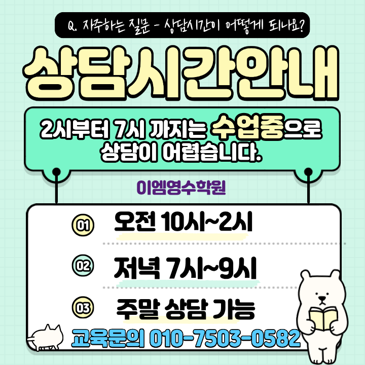 새학년을 준비하는 기간인 만큼 상담전화가 많은데요 그중 상담시간 문의가 많아 안내드립니다. 2시부터 7시까지는 원장이 직접 수업하고 있어 신규상담이 어렵습니다. 전화로 간단한 상담은 언제든지 가능하니 전화로 상담 예약 부탁드립니다~ <img src="https://blogthumb.pstatic.net/MjAyNTEyMzBfODgg/MDAxNzY3MDk0NzQyNzU5.I2cKRCulkQiMgwmauMDOlDeTRDDZUDf3PsXuv9P2v7Ug.KMTuXJdtqNfDlwYI1vBp7zWnEBJ9EP6Y8a0_vd00kicg.PNG/%BB%F3%B4%E3%BD%C3%B0%A3.png?type=s3" />