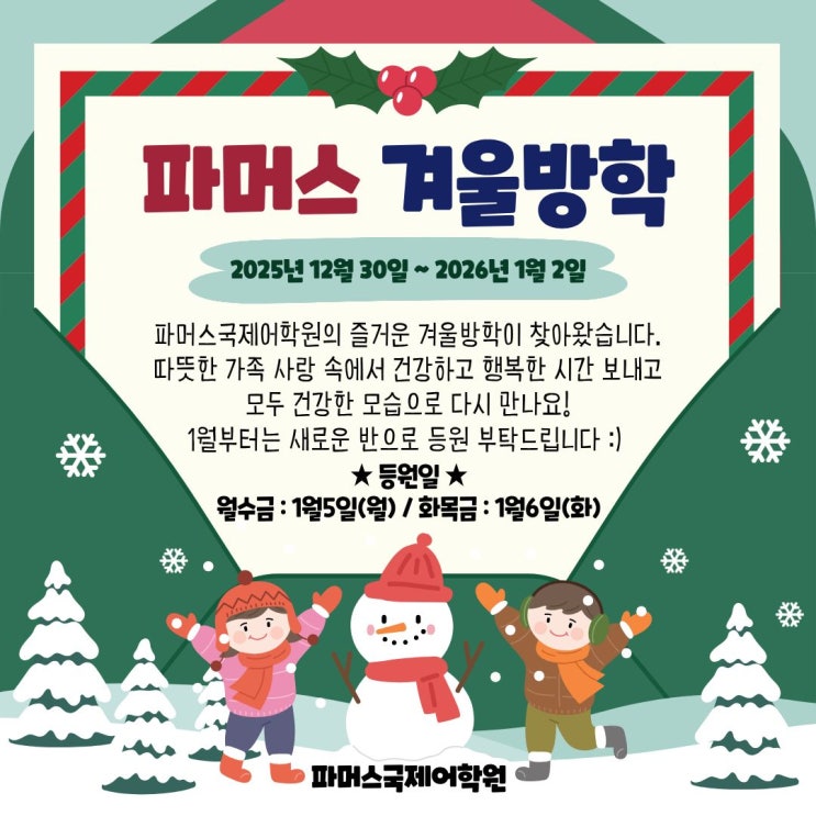 안녕하세요. 파머스국제어학원입니다 2025년 한 해 동안 아이들의 성장을 함께해 주신 학부모님들께 진심으로 감사드립니다. 연말을 맞아 우리 아이들이 잠시 숨을 고르고 새 출발을 준비할 수 있도록 겨울방학 일정 및 1월 등원 안내를 드립니다. 파머스국제어학원 겨울방학 일정 겨울방학 기간 12월 30일(화) ~ 1월 2일(금) 해당 기간에는 ✔ 모든 정규 수업 ✔ 차량 운행 이 모두 운영되지 않습니다. 아이들이 충분히 휴식하고 새 학기 에너지를 채 울 수 있는 시간이 되길 바랍니다 1월 등원 일정 안내 (새 반편성 기준) 2026년 1월부터는 새로운 반편성 기준으로 수업이 시작됩니다. 1월 5일(월) → 월·수·금....... <img src="https://blogthumb.pstatic.net/MjAyNTEyMTVfMTM0/MDAxNzY1Nzc2OTExODg4.BwAkwFCHtp1Bk79hD8ttuHJn8ut7FDN4JMcFgQ-TI2Ug.c2Ad98e1Ua8UR8PMY0c_uSRm8gJhsUKHJ4dflnF9-Sgg.JPEG/2025%B3%E2_%B0%DC%BF%EF%B9%E6%C7%D0_%B0%F8%C1%F6.jpg?type=s3" />