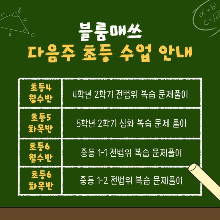 다음주에 진행 될 초등 수업 일정입니다. <img src="https://blogthumb.pstatic.net/MjAyNTEyMTlfMjYz/MDAxNzY2MTM4NTk0MDQ5.9BY08gNmzigLI449915tvgXvAsWRXNH-JZVAW1Wdgfgg.0_0E88K8TJJy7kFItfTGJ9wCm8IAZOB4fuuX4g6j_NMg.JPEG/12%BF%F9_4%C1%D6%C2%F7_%C3%CA%B5%EE.jpg?type=s3" />