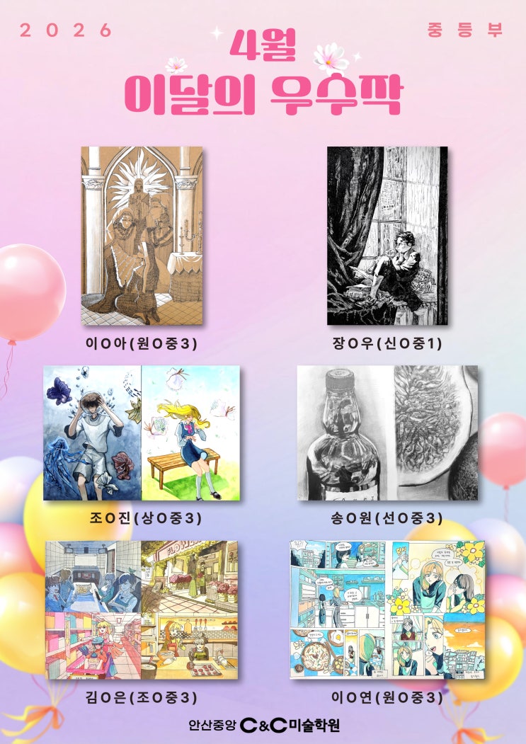 안녕하세요, 안산중앙 C&C미술학원입니다. 기온이 올라가며 봄기운이 가득한, 산뜻하고 따뜻한 4월이 찾아왔습니다~ 노력과 열정이 담긴 중앙C&C학생들의 이달의 우수작을 소개해드립니다! 초등부 는 과감한 색감의 캐릭터와 재미있는 스토리 표현이 흥미롭고 인상적으로 보여주는 작품이네요! 중등부 는 펜화, 소묘, 칸만화 등 완성도 높은 표현력이 돋보이는 작품입니다! 초,중등부 모두 탄탄한 기초와 섬세한 표현력으로 각자의 색깔이 드러나는 작품들이었습니다. 우리 학생들 모두 너무 잘했고, 이달의 우수작으로 선정된걸 진심으로 축하합니다 안산중앙 C&C미술학원에서는 기초부터 심화까지 탄탄하게 성장할 수....... <img src="https://blogthumb.pstatic.net/MjAyNjA0MDNfMjA0/MDAxNzc1MjAxMjg4NDYw.QroL_wcJGwHaDVNPxzi9WgYqNNnX_xE13xszsya4oZkg.WmY0ObA13N7lN6Lf2k1Q21qEbdh9ErheqydQDDUtAXAg.JPEG/%C1%DF%BE%D3_2026-%C0%CC%B4%DE%C0%C7-%BF%EC%BC%F6%C0%DB-004_%282%29.jpg?type=s3" />