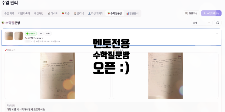 3월이 어느새 빠르게 흐르죠? 흐드러진 봄이 살결로 와닿는 걸 보니. 중간고사란 녀석도 제법 가까이 다가오는 그런 4월 초입니다. 멘토도 이번 주말부터, 본격 아이들과 시험특강을 실시했습니다. 기출문제를 살펴보며 시험과 흡사한 분위기 속에서 OMR까지 적어가며 학습을 하고 있습니다. 가급적 시험에서 찾아볼 수 있는 변수들을 최소화하기 위해 '미리'경험해 보기 진행 중이랄까요. 특히나 새롭게 시험을 보게 되는 학년들이 많아 함께 더 집중하는 시간을 보내고 있어요. 지난번, 멘토만의 관리 웹을 소개해 드렸는데. 여전히 매주, 매달 새롭게 더 아이들의 학습에 최적화된 프로그램으로 구축 중입니다! 그중, 오늘은 수학 문....... <img src="https://blogthumb.pstatic.net/MjAyNjA0MDVfNTUg/MDAxNzc1MzE1MzM3OTYy.ZDicpWfnEVjxG9TCaDLUfq4ah4MLrJRL5U1kmBR-Gpwg.jdxVOvXtsaFDs7X1BonjqrabJISkowHeNb2Bwcyb8e4g.PNG/%BD%BA%C5%A9%B8%B0%BC%A6_2026-04-05_%BF%C0%C0%FC_12.07.26.png?type=s3" />