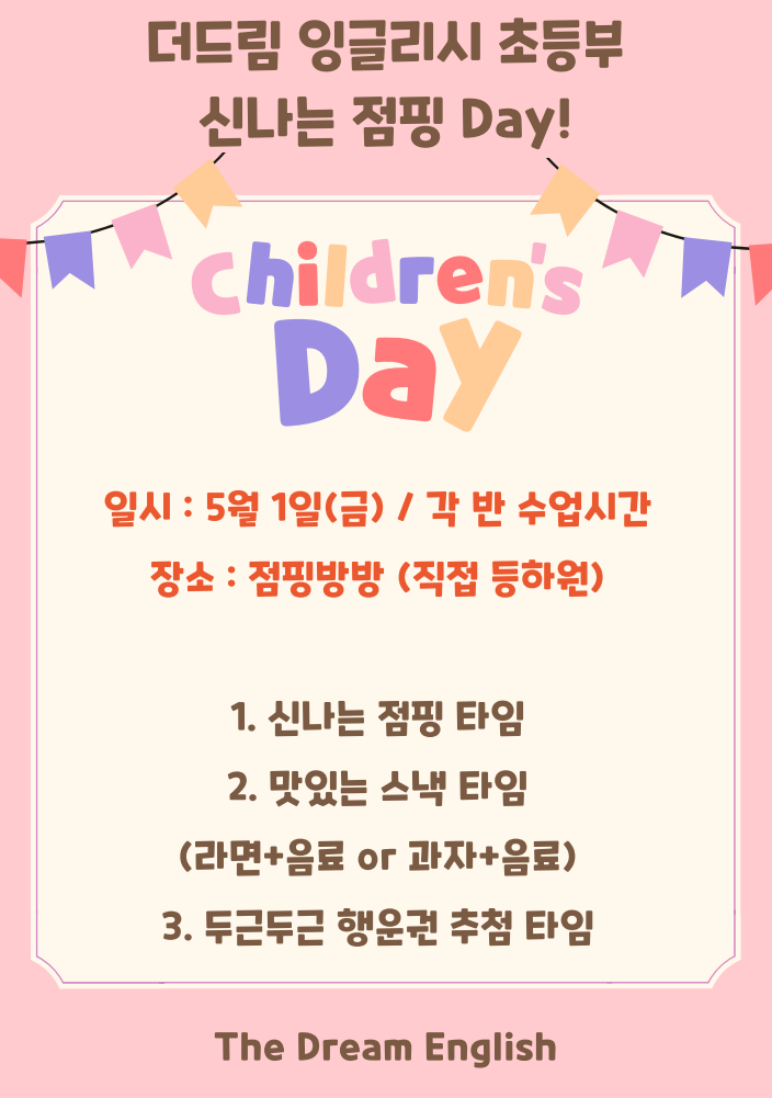 안녕하세요 ^^ 안산 더드림 잉글리시 원장 크리스틴입니다. 아이들이 가장 기다리는 어린이날이 다가오고 있습니다 !! 특히! NO HOMEWORK DAY 가 가장 큰 선물이라고 하네요^^ 저희 더드림에서는 이번 어린이날을 맞아 우리 아이들이 쌓였던 스트레스는 날려버리고, 다시 열공할 에너지를 충전할 수 있도록 특별한 이벤트를 준비했습니다. 물론! 초등부와 중등부 이벤트는 다르게 진행됩니다^^ 지금 바로 확인해 보세요! 1. [초등부] 신나는 점핑 Day! "오늘은 공부 대신 점프!" 에너지 넘치는 우리 초등부 친구들을 위해 이번에는 강의실을 벗어납니다! 친구들과 함께 마음껏 뛰어놀며 웃음소리 가득한 하루를 만들 예정이에요. 일시....... <img src="https://blogthumb.pstatic.net/MjAyNjA0MDZfMTc0/MDAxNzc1NDA2MTYyNTcy.oNLFA5pGW5Xkbt4LfTO6UyuqdC3b9y6gm5G6dXRiyCUg.hAiukSbyrJ-Ng2XfH8GuzU9wlr-5WAZ95pQ54UvMWd0g.PNG/1.png?type=s3" />