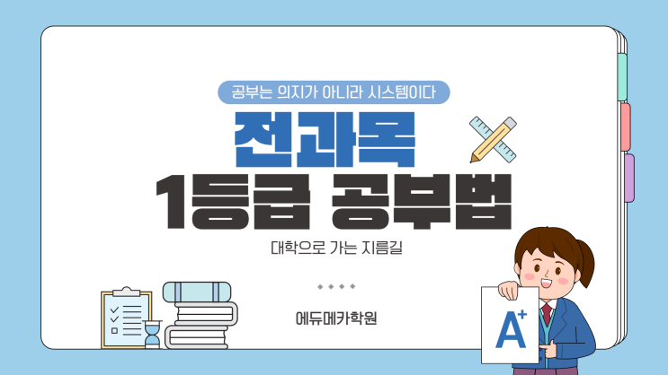 고등학교에서 1등급을 받기 위해서는 가장 중요한 건 본인의 의지가 아니라 1등급이 나올 수 있는 시스템를 구축하는 것이다. 1️⃣ 학습 관리의 큰 구조 (이게 먼저다) ✔ 공부의 우선순위 학교 수업 이해하기 내신 시험 대비하기 과목별 기본 역량 축적하기 (여유 있을 때) 수능 감각 기르기 생활 관리 → 시간 관리 → 과목 공부 과목 공부만 하면 실패한다 2️⃣ 일일·주간·월간 학습 계획 설계 일일 계획 (현실형, 반드시 지켜지는 구조로 만들기) 평일 기준 학교 수업 + 수행평가 => 이미 공부 완성하기 집에서 할 공부는 3~4시간이면 충분 일일 기본 루틴 과제/숙제 (필수) 국어 40분 사회 or 한국....... <img src="https://blogthumb.pstatic.net/MjAyNjAxMjdfNzkg/MDAxNzY5NDk0NjM1OTE0.eH9kJzc0Ladp6TUmuv9bNwHY6jKahzuPXYb8MKnQEsIg.e4dxA--xIGHoGekibkSaJTBByshc0DB51ivrLcPzas8g.PNG/%C1%A6%B8%F1%C0%BB_%C0%D4%B7%C2%C7%D8%C1%D6%BC%BC%BF%E4_-001_%285%29.png?type=s3" />
