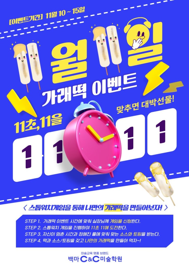 안녕하세요! 백마씨앤씨미술학원 디자인전문관입니다~! 저번달인 11월에 있었던 이벤트를 말씀드리기위해 찾아왔습니당~ 11월 11일은 빼빼로 데이라는 이름이 익숙하시겠지만 매년 주던 평범한 빼빼로 대신, 신박한 게임을 통해 선생님이 직접 구워주는 가래떡 이벤드로 준비를 해보았습니다. 바로바로~~~ 11.11초 맞추기 게임 학생들이 11.11초를 정확히 맞추면 가래떡 1개 + 소시지 1개 + 소스토핑무제한! 11.11초를 가깝게 맞추면 가래떡 1개 + 미니소시지 + 소스토핑무제한! 이라는 즐거운 보상이 걸려 있어서 아이들이 더욱 열정적으로 참여했고, "조금만,더!" 하며 긴장감 있게 시간을 맞추는 모습이 정말~ 귀여웠답니다~! 게임....... <img src="https://blogthumb.pstatic.net/MjAyNTEyMTdfMTM4/MDAxNzY1OTU1MDM1Njk3.xoGbX2aj_iBU438KFG0HJEzHFCQT2eyIYVFYMaRwPrkg.fwjLN74CslT5so4qj2neRMByGhHg3-Dj4-coWM8RyuIg.JPEG/b_c26Ud018svc9h9meg5m812y_rembac.jpg?type=s3" />
