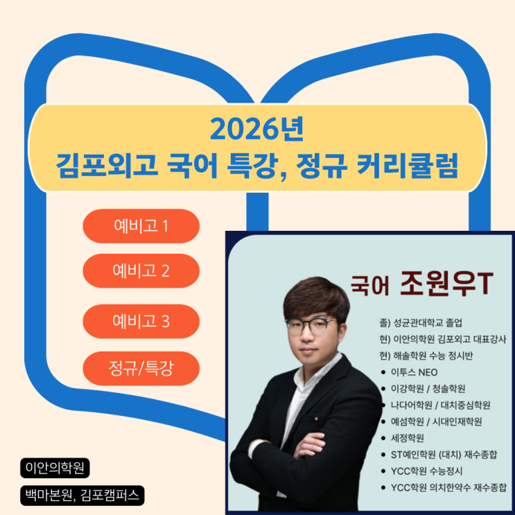 김포외고는 국어 교육에 있어 1학년부터 3학년까지 체계적이고 단계별로 맞춤형 수업을 제공하여, 학생들의 실력 향상과 수능 성적 극대화를 목표로 운영되고 있습니다. 각 학년별로 정규반과 특강 과정이 구분되어 있어, 학생들이 자신의 학습 수준과 목표에 맞춰 효율적으로 준비할 수 있습니다. 1학년 국어 커리큘럼 (예비고1) - 정규반: 1학년 국어는 문법과 문학의 기본 개념을 중심으로 탄탄하게 다집니다. 문법은 체계적 이해가 되도록 쉽게 접근하며, 문학에서는 다양한 작품을 통해 독해력과 감상 능력을 키웁니다. 예비고 수준에 맞춘 ‘기본 개념 완성’ 과정으로, 이후 고난도 문제에 대비할 기초를 확실히 다지는 수업입니다. 중학....... <img src="https://blogthumb.pstatic.net/MjAyNTEyMjBfMTg1/MDAxNzY2MTYyMDc2MDI1.TU2_MlLaAxXWHiYvgmA4KGwG16300Tw370tWIwO1Ttsg.K2G_VySDp0BovXFNT7FOdi0hTKnK3SVWxlL2avbYdVog.PNG/%B1%E8%C6%F7%BF%DC%B0%ED_%B1%B9%BE%EE%C7%D0%BF%F8.png?type=s3" />