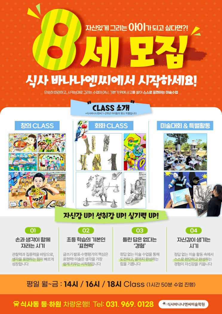 [식사바나나엔씨 8세 모집!] 학교 갈 준비, 미술로 시작해보세요!! “엄마, 이건 내가 생각한 거야!” 학교 가기 전, 아이에게 가장 필요한 건 ✔️말로 표현하는 힘 ✔️ 생각을 꺼내는 용기 ✔️ 해냈다는 자신감입니다. 식사 바나나엔씨미술학원은 그림을 통해 아이가 스스로 표현하고 자신감을 키우는 수업을 합니다. ♥학교앞 등하원 차량 운행 ♥ 교육문의 및 예약 TEL. 031-969-0128 <img src="https://blogthumb.pstatic.net/MjAyNjAxMjdfMTE2/MDAxNzY5NTA4MTIwNTMy.Nw7jAqupKPgcTPLE-X8l9BU4US9WGTacBi3ep4kuqWIg.pAeePn1WvQzgnjx2ZWHVHXD3980I4WfVTQx4kbMLpr0g.JPEG/KakaoTalk_20260127_184324894.jpg?type=s3" />