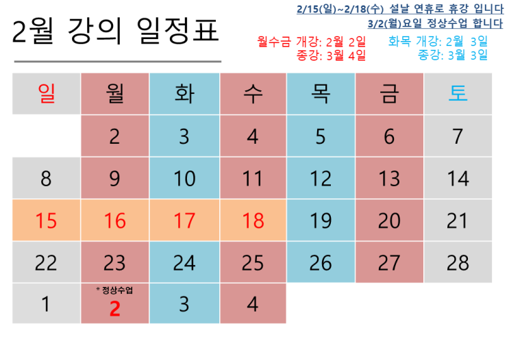 현재 모든 일반강좌 수업은 개인수업 혹은 2인 그룹으로만 진행되오니 자세한 수업 시간과 수강료는 학원으로 문의 바랍니다. <img src="https://blogthumb.pstatic.net/MjAyNjAxMjdfMTc0/MDAxNzY5NTEwMjAwOTE1.QXlzcBZV_gFw_Jjyj1FtYQIa8CH4qfyDxO45jGf6ZaYg.qTNNjBbD93SCQdH6opXNXXAhj-_IqBlJebiTc_zoJ2kg.PNG/2026_2%BF%F9_%B0%AD%C0%C7%C0%CF%C1%A4%C7%A5.png?type=s3" />