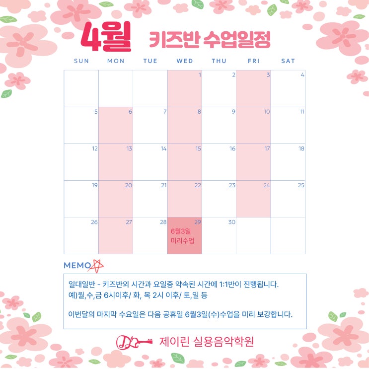 제이린 키즈 여타 다른 학원과는 다른 제이린 실용음악학원만이 가진 큰 장점!!!!!! 초등학생을 위한 실용음악전문반 제이린키즈반의 4월 수업 일정입니다. 월, 수, 금 2시~ 6시까지 운영됩니다. 일대일반은 키즈반외의 시간과 요일 중에서 약속된 시간에 진행됩니다. 월, 수, 금 6시이후/ 화, 목 2시이후 / 토, 일 #일산실용음악학원 #일산드럼학원 #일산보컬학원 #일산기타학원 #제이린실용음악학원 #J린실용음악학원 #초등전문실용음악학원 #초등기타 #초등드럼 #초등베이스 #초등우쿨렐레 #초등건반 #초등피아노 <img src="https://blogthumb.pstatic.net/MjAyNjA0MDFfMyAg/MDAxNzc1MDI1NDIyNDYy.AN6vs_qw3JpMsbkf23fS3P6rvLMX9a62RXPJt5-KzDkg.Ou_Fi8MeVryZNBOkCU5uC7Z5ngKB0YRXyl_xNFw-iPIg.JPEG/%BF%AC%C8%DE%B0%F8%C1%F6-001.jpg?type=s3" />