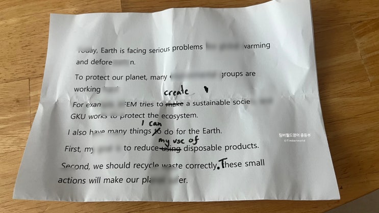 시험기간이 돌아왔습니다. 이제 한달도 안남았는데요 중학생 아이들이 내신준비( 1-3과) 뿐만아니라 수행평가와 외부지문에 한과목만해도 이렇게 바쁘고 정신없는 시기에 안타깝기도하면서 열심히하는 친구들의 미래를 위해 더 열심히 도와야겠다는 생각이 드는 요즘입니다. 중학생 아이들에게 학교 수행평가와 외부지문이 있으면 미리미리 가져오라고하는데요 이번에 대화중에서 수행평가 writing이 있었습니다. 요즘은 chat gpt로 인해서 아이들이 너무 쉽게 영작을 하고 있는데요 그래도 컴퓨터가 바꾸는만큼 자연스럽지 못한 부분이 생길 수 있습니다. 팀버월드에서는 영국원어민 샘( 영국에서 영어전공)이 직접 고쳐주고 계십니다^^ 그리고....... <img src="https://blogthumb.pstatic.net/MjAyNjAzMzBfMjgg/MDAxNzc0ODYzMTIzNDgw.xS99h_aFI1eDNzkI4afpzYMFbAAyGmQer2_Xzy8n9XAg.6e1jGAnEn08HYawdJVYkHJ5-C7wJ8U3SzKlp5Sg1aGYg.JPEG/KakaoTalk_20260326_154355794.jpg?type=s3" />