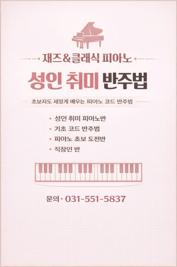 성인 피아노 취미반 모집 재즈&클래식 피아노 성인 / 직장인 취미반 모집~ 초보자도 쉽고 재밌게 배울 수 있는 코드 반주법! ● 성인 피아노 취미반 ● 기초 코드 반주법 ● 피아노 초보 도전반 ● 직장인 취미반 기초부터 차근차근 배우며 피아노를 도전해봐요~~ 전화 및 방문 상담 가능합니다☎️ 031-551-5837 <img src="https://blogthumb.pstatic.net/MjAyNjAxMTBfMTQw/MDAxNzY4MDI0NzYzMTE3.jMCYxdJm98tF5sekGuJbHQppfUk1AjW_R5ceyRFUnQ4g.AsV0vJa69S37vx84Vn2D9U1HRtHSntxviSCR7zghIyEg.PNG/900%A3%DFfile%A3%DF00000000710071fda9f33b91ca925458.png?type=s3" />