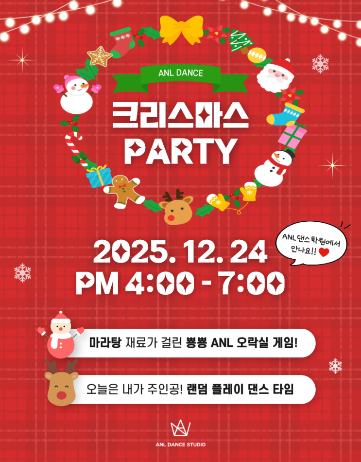 안녕하세요 #다산댄스학원 #구리댄스학원 #별내댄스학원 ANL 댄스학원입니다! 어느덧 2025년의 끝자락, 한 해 동안 땀 흘리며 연습하고 무대 위에서 반짝이던 아이들의 모습이 하나하나 떠오르는 요즘이에요. 춤을 처음 배우며 설렘 가득 들어오던 날부터 이제는 음악만 나오면 몸이 먼저 반응하는 모습까지, 그 모든 순간이 모두 너무 소중하고 감사한 시간들이었답니다 그래서! 열심히 달려온 우리 아이들과 이 한 해를 웃음과 추억으로 마무리하고 싶어 ANL에서 특별한 크리스마스 파티를 준비했어요 ✨ ANL 크리스마스 파티 안내 2025년 12월 24일 (화) 크리스마스 이브 ⏰ 오후 4시 ~ 7시 ANL 댄스....... <img src="https://blogthumb.pstatic.net/MjAyNTEyMjBfMTA4/MDAxNzY2MjA4OTYxOTY2.o9dUK851bR9FG7JGXhQ00kAHHIkOZP2KvHTBAJ0BTMYg.pNT6UwG4hN4uTHIDvOHEMWC1eAOihCb38OU_5kKv7B4g.PNG/%C1%A6%B8%F1%C0%BB_%C0%D4%B7%C2%C7%D8%C1%D6%BC%BC%BF%E4_%283%29.png?type=s3" />