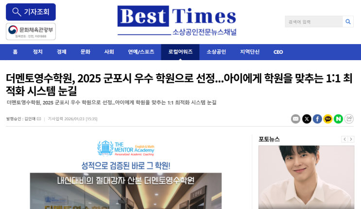 더멘토영수학원, 2025 군포시 우수 학원으로 선정...아이에게 학원을 맞추는 1:1 최적화 시스템 눈길 발행승인 : 김인애 | 기사입력 2026/01/23 [15:35] 믿고 맡겨주신 소중한 아이들. 결과로 보답하겠습니다! <img src="https://blogthumb.pstatic.net/MjAyNjAxMjNfMTE3/MDAxNzY5MTY1NjE0MjI1.xnr7ePa3tTUJYayQ937qcrYJ1AihtIPGn0sp0rZBCeEg.LXOCtDRbgHVlYmR7wkbjbF1M_eGN2sdAu8AoLxs44eog.PNG/1.png?type=s3" />