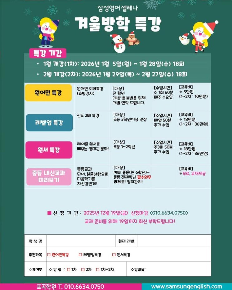 안녕하세요 삼성영어 셀레나 포곡학원입니다. 길고 길 것 같았던 겨울방학 벌써 1월이 끝나가고 있어요. 지금이라도 아이에게 뭔가 해줘야 할 것 같은데,, 그 뭔가가 뭔지! 참 결정하기 어렵습니다. 방학 특강이 과연 우리 아이에게 맞을까? 방학 특강이면 문법을 공부하는 건가? 한 달이나 흘렀는데 이미 늦은 건 아닐까? 하는 등의 고민들이 우리의 결정을 더욱 어렵게 합니다. 가장 먼저 말씀드릴 것은 지금 시작해도 늦지 않았다는 겁니다. 남은 방학동안이라도 우리 아이에게 맞는 학습을 하면 분명한 변화가 생깁니다. 삼성영어 셀레나 포곡학원의 방학 특강은 어떤 특별한 비법이 있는 지 같이 한 번 살펴볼까요? 우리 아이 유형, 먼저 파....... <img src="https://blogthumb.pstatic.net/MjAyNjAxMjdfMjk5/MDAxNzY5NDkxMjAwODg5.ELIiA_NN8Pp5cKtuMC3eKcY7-FSbpG70piBjM_CagSUg.xQ62kujrQwv1viOjE5m09BlU1Dte_SLpXYx_OiLmDAkg.JPEG/%B9%E6%C7%D0%C6%AF%B0%AD.jpg?type=s3" />