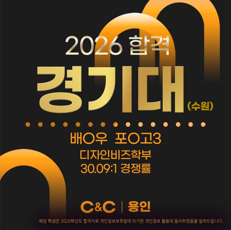 안녕하세요 용인 씨앤씨 미술학원입니다. 바쁘단 핑계로 미루던 합격 소식을 이제사 올립니다. 먼저 경기대 입니다 합격자는 모두 수시 전형 합격자이며 정시 전형 합격자는 별도 표기 됩니다. 합격을 축하 합니다. 용인씨앤씨미술학원은 2008년 개원이후 꾸준히 높은 합격률을 유지해왔고 올해는 더욱 빛나는 결과를 가져 왔습니다. 대부분 치열한 경쟁률의 수시 전형에서 높은 실기 반영율을 뚫고 만든 결과는 그만큼 실력은 검증이 무의미 할 정도로 확실한 선택이라 하겠습니다. 경기대 디자인비즈학부 수시전형은 24명을 모집하는 학생부종합전형과 34명을 모집하는 실기위주 전형이 있습니다. 합격자 모두 실기 위주 전형 합격자입니다. 실....... <img src="https://blogthumb.pstatic.net/MjAyNjAzMjBfMjQg/MDAxNzczOTgzMjYwMDU2.mtu6jFaGcYrRxfJ2eYMw0u6vcyvFf6OJ_SEizsKwmm4g.DE-yDxZ0vJMUCr1hj3wZjlzkJR1Aa-CwCIybLvfkNEUg.JPEG/26_9%B0%E6%B1%E2_%B9%E8%BF%AC%BF%EC_%C6%F7%B0%EE__%BA%ED%B7%CE%B1%D7.jpg?type=s3" />