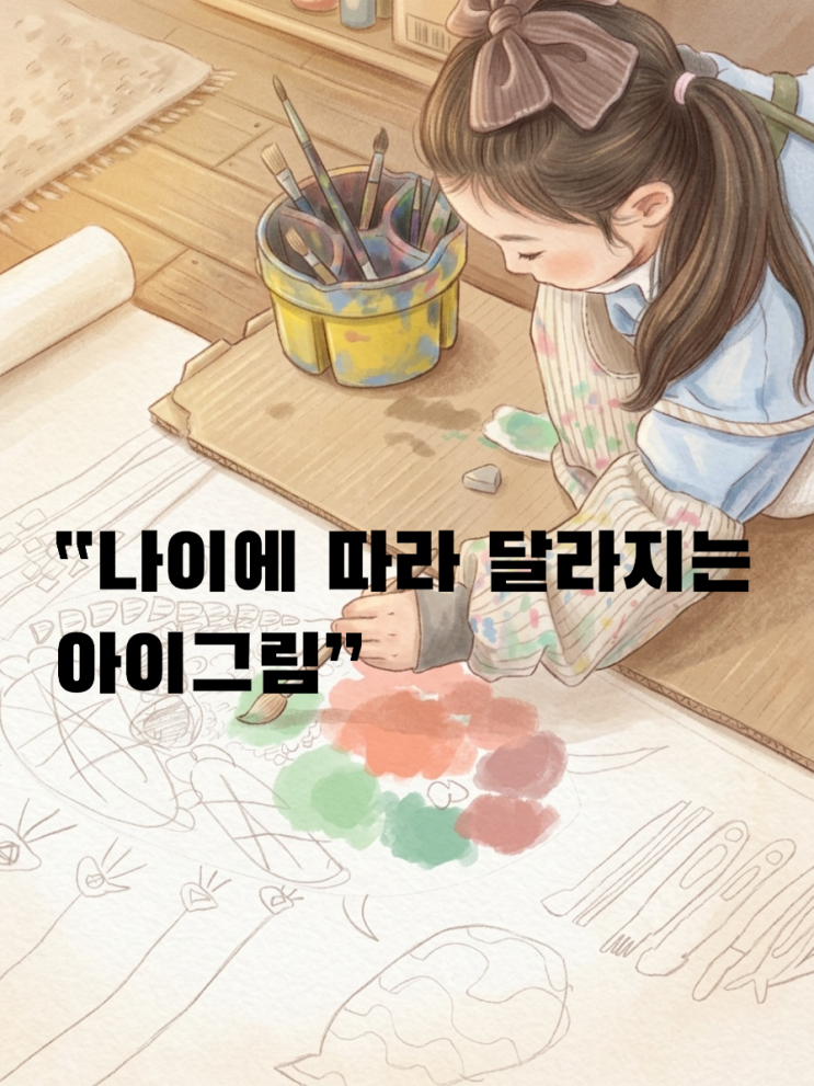 부모님이 가장 안심하셔야 할 부분 중 하나는 아이 그림은 원래 계속 변한다는 사실입니다. 2~4세에는 낙서 중심의 표현이 나타나고 4~6세에는 단순한 형태와 사람 모양이 등장하며 6~8세에는 눈에 보이는 대상을 조금 더 구체적으로 그리기 시작합니다. 8~10세쯤 되면 또래들 사이에서 유행하는 그림 방식이나 캐릭터 표현을 서로 따라 하는 모습도 많이 보입니다.이 시기의 아이들이 비슷한 그림을 그린다고 해서 창의성이 없는 것이 아닙니다. 모방은 발달의 자연스러운 과정이기 때문에 따라 하면서 관찰하고 관찰하면서 자기 방식으로 바꾸어 가는 것이 아이들입니다. 그래서 아이의 그림을 볼 때는 ‘잘 그렸다,못 그렸다’보다“지금 이 아....... <img src="https://blogthumb.pstatic.net/MjAyNjAzMjZfMjIg/MDAxNzc0NDg4MzYwMjE4.8-Cm5Dse9MwNQajDi6p9lmskUL7iTnbIf-3xQUGV7V8g.J7gNEr5CKjvONMNEF2NHYj0YuJhjrxUE1z-JfBsmc1Ug.PNG/Photoroom%A3%DF20260326%A3%DF102535.png?type=s3" />
