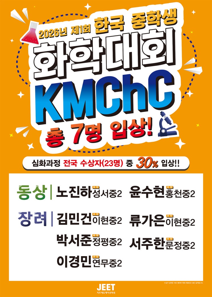 2026년도 제 1회 한국중학생화학대회 KMChC 에서 동상 : 2명 / 장려 : 5명 "총 7명 입상"을 했습니다. "심화과정 전국수상자 총 23명 중 30% 입상" 학생들 입상을 진심으로 축하합니다!!! <img src="https://blogthumb.pstatic.net/MjAyNjA0MDNfMjQ1/MDAxNzc1MjA3MzA3MTAw.DRZSOnMHJIk3vwpBAfHj6963NMBnvw3xJxAsA4949Ukg.I7PiE695hFzIdFmN3Fm_55D5ArAEBdGB0ci2oyF6AWsg.JPEG/2026%B3%E2%B5%B5_1%C8%B8_%C7%D1%B1%B9%C1%DF%C7%D0%BB%FD%C8%AD%C7%D0%B4%EB%C8%B8_%C0%D4%BB%F3%C0%DA_%C6%F7%BD%BA%C5%CD_h_260403.jpg?type=s3" />