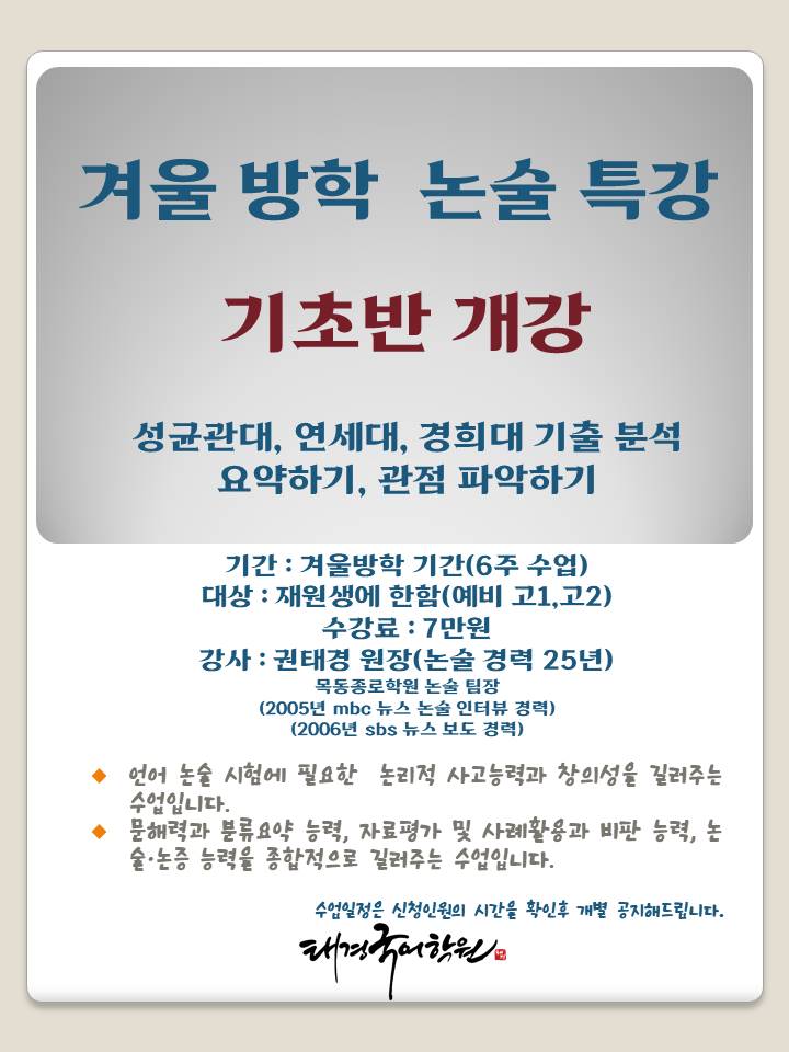 겨울방학 논술 특강이 개강을 합니다.