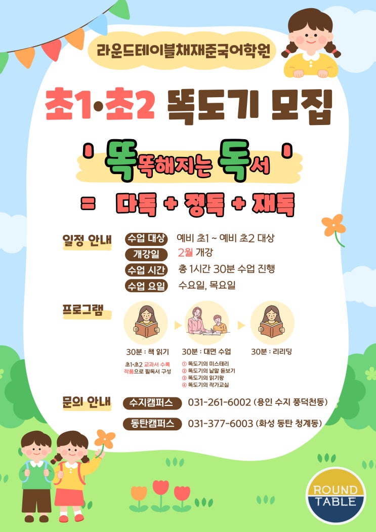 ⭐️ 라운드테이블채재준국어학원 - 초1 · 초2 수업 '똑독' 2월 대개강 ⭐️ [라운드테이블채재준국어학원] - 2026학년도 초1 · 초2 '똑독' 2월 개강 ✅ 수업 대상 : 초1, 초2 대상 ✅ 개강 : 2월 개강 ✅ 똑독 필독서 : 초1, 초2 교과서 수록 작품으로 구성 ✅ 똑독 수업 신청 ☎️ 수지캠퍼스 : 031-261-6002 동탄캠퍼스 : 031-377-6003 - 동탄캠퍼스 카카오톡 상담 채널 OPEN ⭐️ 카카오톡채널 - 라운드테이블채재준국어학원동탄캠퍼스학원 (kakao.com) 동탄캠퍼스 위치 → 화성시 동탄대로시범길 148-54, 헤븐리원빌딩 5층 (청계동/ 카림항아리상가) 라운드테이블채재준국....... <img src="https://blogthumb.pstatic.net/MjAyNjAxMTFfMjEy/MDAxNzY4MTE4ODc3MDc2.hrqjH11n81V5KuAGrwnCX6ITGXfibVRxXwTjxlIPFScg.eglX7cydKPm3mrw7ja69vCq5o2Iw8itzEySDnPucriUg.JPEG/%C1%A6%B8%F1%C0%BB-%C0%D4%B7%C2%C7%D8%C1%D6%BC%BC%BF%E4_-001_%2814%29.jpg?type=s3" />
