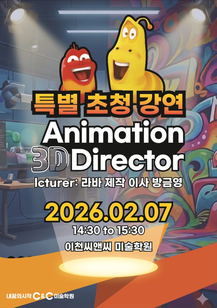 안녕하세요~!! 이천씨앤씨 입니다!! 여러분은 어렷을 적 3D 애니메이션을 많이 보셨었나요?? 이번 다가오는 2026.02.07일!!! 우리나라 3D 애니메이션 시장의 자랑이시죠!! 전 세계 190개국을 사로잡은 애니메이션 <라바(Larva)>의 탄생 주역, 방금영 제작이사님을 직접 모시고 특별 강연을 진행합니다!! 바쁘신 와중이신데도 저희 학원 학생들을 위해 귀한 시간을 내주시는 방금영 이사님께 감사의 말씀 올립니다!! 2D 아이디어가 어떻게 생동감 넘치는 3D 애니메이션으로 구현되는지, 실제 산업 현장의 제작 프로세스를 직접 들을 수 있는 아주 귀한 기회입니다~!! 세미나 정보 일시: 2026년 2월 7일 (토) 오후 2:30 ~ 3:30 장소: 이....... <img src="https://blogthumb.pstatic.net/MjAyNjAxMjlfMyAg/MDAxNzY5NjY1NDc2NTg0.d1DCWePWDx7jcQnkmXDnKHJX9AtVxHdSQ5tPYIsQWB0g.mQL0e4DzNUIUdi1GNeVCYnYpesdjJ4Cn_v3-97d_Kp8g.JPEG/KakaoTalk_20260129_143611652.jpg?type=s3" />