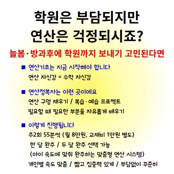 학원 보내기 고민되시죠? 그래도 연산은 계속 마음에 걸리고요. 특히 이런 고민 많으세요. ✔ 연산이 느린데 계속 미루는 아이 ✔ 숙제 시키면 싸우게 되는 경우 ✔ 학원 보내도 진도만 나가고 실력은 그대로인 느낌 그래서 저희는 “아이마다 속도가 다르다”는 전제로 연산 시스템을 다시 만들었습니다. ■ 연산정복자는 다릅니다 단순 반복이 아닙니다. ✔ 부족한 연산 구멍 찾기 ✔ 복습 + 예습 구조 ✔ 필요한 부분만 정확하게 학습 그래서 “많이 푸는 연산”이 아니라 “쌓이는 연산”이 됩니다 ■ 가장 큰 특징 : 속도 선택 가능 아이마다 속도가 다르기 때문에 완주 기간을 선택할 수 있습니다. ✔ 한 달 완주 플랜 → 빠르게 실력 올리....... <img src="https://blogthumb.pstatic.net/MjAyNjA0MDNfMTIz/MDAxNzc1MjEyMzg3MDkz.2FS7RjaldP2oA0ZRpQJw9bfhtJU8pJlsupISE2G8Cl4g.clnMCw08tJbz-rD9881OIlvnZNIzVU7dWRtCkq2wMSUg.JPEG/%BA%B9%BB%E7%BA%BB_%BF%AC%BB%EA%C1%A4%BA%B9%C0%DA_2.jpg?type=s3" />