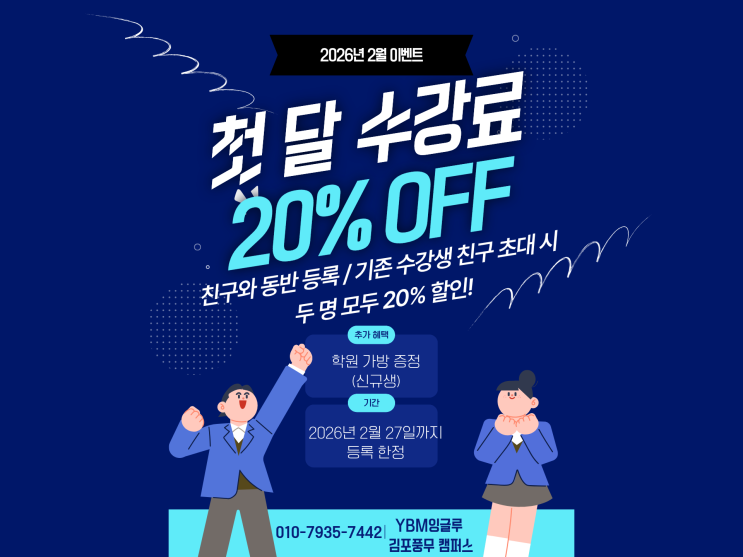 안녕하세요~ YBM잉글루 김포풍무 캠퍼스 이세미 원장입니다. 하기와 같이 2026년 2월 등록 이벤트 중이오니 많은 관심 부탁드립니다. 친구와 동반 등록 또는 기존 수강생 친구 초대 시 두 명 모두 20% 할인! 상담 가능 시간 : 평일 오후 2시 - 8시 방문 상담 시 미리 예약 부탁드립니다. #풍무동영어학원 #풍무동초등영어학원 #풍무동중등영어학원 #풍무동고등영어학원 #풍무동월드메르디앙영어학원 #풍무중영어학원 #양도중영어학원 #풍무고영어학원 #양도초영어학원 #유현초영어학원 #풍무동당곡마을영어학원 <img src="https://blogthumb.pstatic.net/MjAyNjAxMjhfODQg/MDAxNzY5NjAwNTg0NTk1.DAjx6DoyGFDvNypMIcIBTzdzbFIAn8P91Zhz4dGwcVYg.-4d7uRLBg2izLk4KxvHxGxD5ptr7b-9YgPYqNFwRsnUg.PNG/%C1%A6%B8%F1%C0%BB_%C0%D4%B7%C2%C7%D8%C1%D6%BC%BC%BF%E4._%281%29.png?type=s3" />