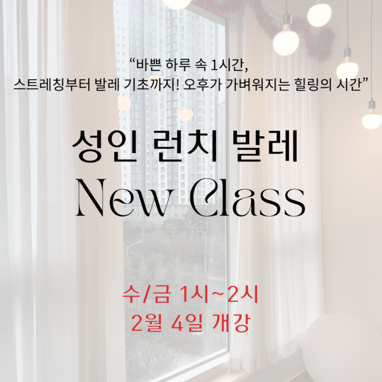 안녕하세요 : ) 운양동 발레전문 교육기관 지니엘 발레 아카데미 입니다! 지니엘 발레에서 성인발레 입문반 2026년 2월 4일 첫수업으로 개강되는 “런치 발레” 신규반이 개설되어 안내 드립니다! 바쁜 하루 속 1시간, 몸과 마음을 리셋하는 시간✨ 나를 위한 우아한 힐링 ‘런치 발레’ 신규반이 오픈 됩니다. 반복되는 일상과 딱딱하게 굳은 어깨, 말린 자세들 점심시간을 활용해 몸을 가볍게 깨워보는 건 어떨까요? 스트레칭부터 발레 기초까지 무리없이 차근차근 배워봅니다. 수업 요일: 주2회 수요일/금요일 수업 시간: 1시~2시(60분) 수업 레벨: 입문 기초 ❤️이런 분들께 추천 합니다❤️ ✔️점심시간을 활용해 운동하고 싶....... <img src="https://blogthumb.pstatic.net/MjAyNjAxMzFfOTEg/MDAxNzY5ODY3NDMxODM2.p2foCOGyHb3SHuKlL7sm7hECiIarJVt2wsHeXTLRkrcg.x6_JSzJbKO5JzEHOAFVxkIjdLE9JvguGbXRWxbO4XvEg.PNG/%C3%CA%B5%EE%B9%DF%B7%B9_%C1%D6%B8%BB%B9%DD_OPEN%C0%C7_%BB%E7%BA%BB.png?type=s3" />