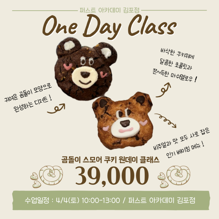 안녕하세요 김포 베이킹 제과제빵학원 퍼스트 김포점입니다 4월을 맞아서 특별한 원데이클래스를 준비했어요 귀엽고, 맛있고, 만드는 재미까지 있는 클래스 ! 곰돌이 스모어 쿠키 원데이클래스 초콜릿과 마쉬멜로우가 올라간 꾸덕한 르뱅쿠키를 베이스로, 곰돌이 얼굴 모양도 직접 잡고 눈, 코, 입 디테일 데코까지 귀여운 비주얼로 완성... 선물용디저트로 활용하거나 아이들과 함께 좋은 추억을 쌓는 키즈베이킹에도 적합한 클래스가 될 것 같아요✨ 수업 일정 4월 4일 (토) 단 하루 ! 10:00 ~ 13:00 수강료 1인 39,000원 (재료비 모두 포함) ✔ 김포 원데이클래스 찾고 계신 분 ✔ 취미베이....... <img src="https://blogthumb.pstatic.net/MjAyNjAzMzFfMjUg/MDAxNzc0OTIzODEyMTgx.AwQv9OtumKB9E7bEurny7HKGChMfsAtvo2l9nf7zcsQg.1IDE4FWWt_blmbAzHUCKd4_L0bh0BeeDBuUuzLlSbRkg.PNG/%BF%F8%B5%A5%C0%CC_%B0%F5%B5%B9%C0%CC%B8%A3%B9%F0.png?type=s3" />