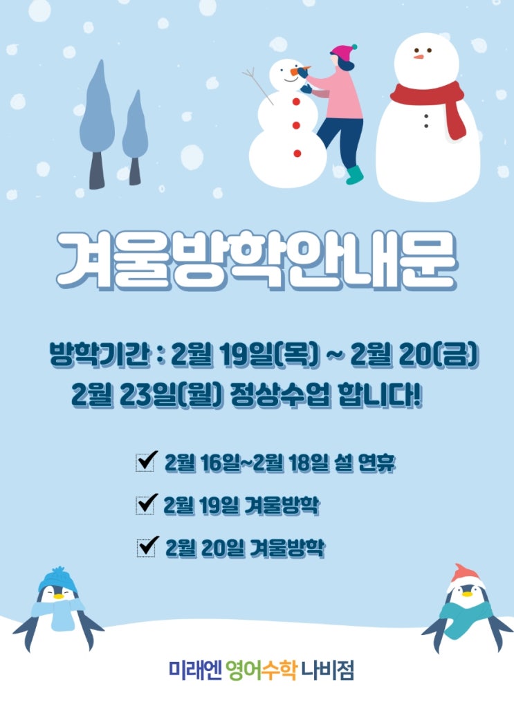 겨울방학안내드립니다. #겨울방학안내 #미래엔영어수학나비점 <img src="https://blogthumb.pstatic.net/MjAyNjAxMzFfMTEg/MDAxNzY5ODYxMjYyMzI0.ss-Rzq6Pj6R488A1y6lOiZ5FFclZXcWEyMxR0cECTCgg.5mlBe38990jELPwPzO4RAaMnJZAesVH30OFPdmaSriIg.JPEG/900%A3%DF%C1%A6%B8%F1%C0%BB%A3%AD%C0%D4%B7%C2%C7%D8%C1%D6%BC%BC%BF%E4%A3%DF%A3%AD001.jpg?type=s3" />
