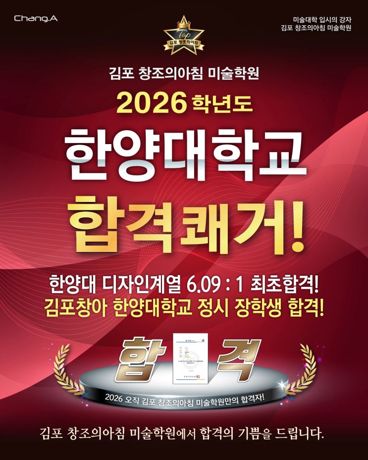 2026학년도 한양대학교 디자인계열 정시 합격 김포창조의아침 미술학원 합격 소식 안녕하세요? 운양동미술학원 김포 창조의아침 사우(본원)입니다. 2026학년도 미술대학 정시 입시에서도 운양동미술학원 김포 창조의아침은 결과로 증명했습니다. 높은 난이도의 실기와 수능을 동시에 요구하는 한양대학교 디자인계열 정시 전형에서 합격자를 배출하며, 다시 한번 실기·정시 대비에 강한 김포미술학원임을 보여주었습니다. 합격 전형 한눈에 보기 대학 : 한양대학교 계열 : 디자인계열 전형 : 2026학년도 정시 전형 전형 특징 : 수능 45% + 실기 55% 합격자 : 권○준 (솔터고 3학년) 한양대 디자인계열 정시는 정시임에도 불구하고 실기의 비....... <img src="https://blogthumb.pstatic.net/MjAyNjAyMDJfMTk3/MDAxNzY5OTg4NjE3MjM2.An28iUAyMJJzS5FIbPRUnM7lglZ2hRXelOsB0Qm--c0g.KsoD4W0nILLEI6FhxtfWISklAKAbqop1bYqDlOJ1_QAg.JPEG/2026_%C7%D1%BE%E7%B4%EB_%BC%F6%BD%C3_%C7%D5%B0%DD%C0%DA_%BC%D2%B0%B301.jpg?type=s3" />