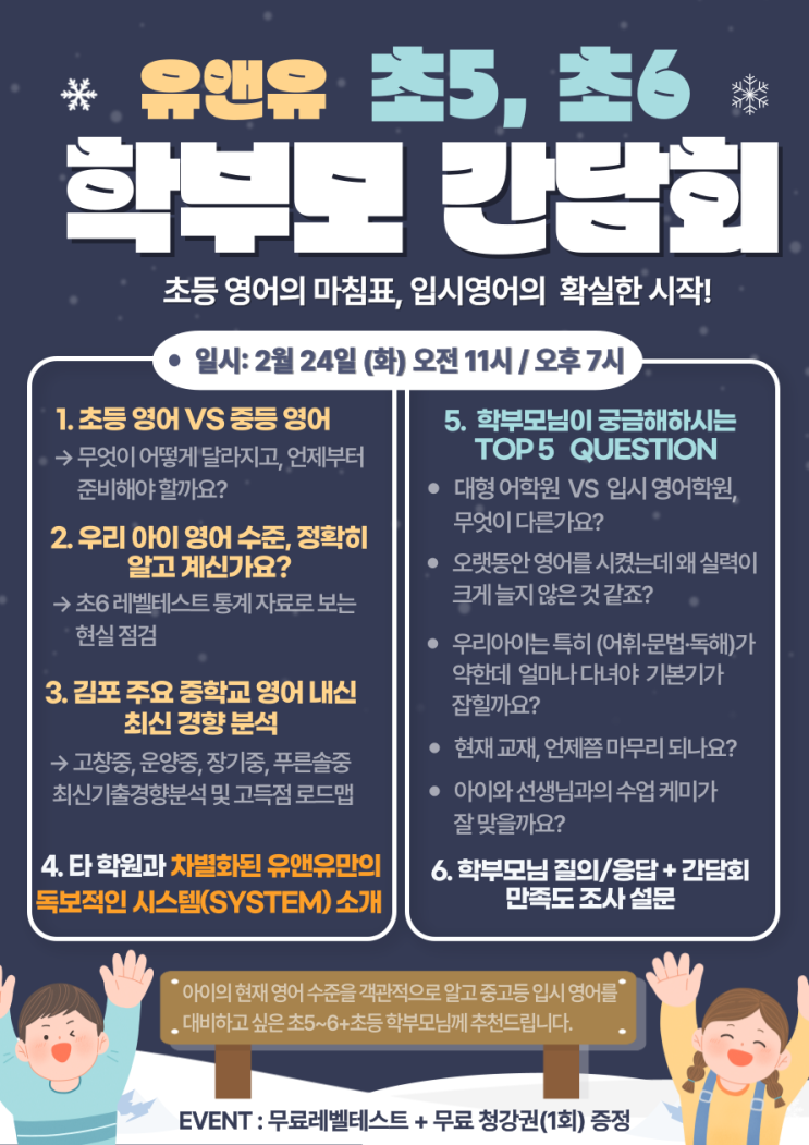 유앤유 영어전문학원이 2월 24일 초5, 초6 간담회로 김포 지역 학부모님을 모십니다^^