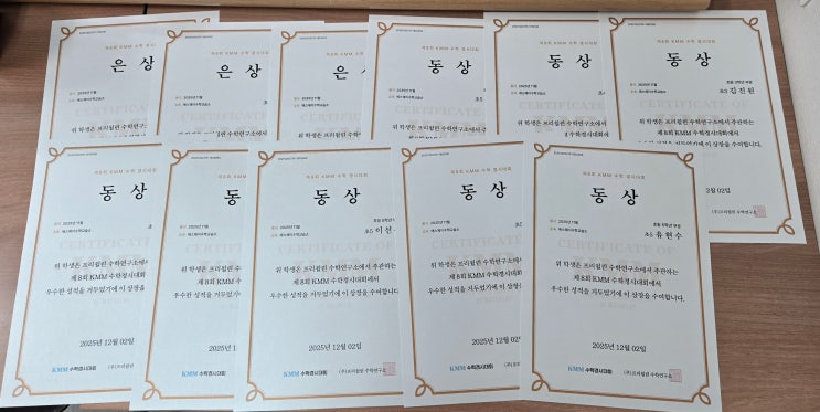 6회, 7회 경시에는 촬영도 못하고 배너 신청도 못한 이슈로 결과를 못 올렸어요. 이번에도 촬영 못한 반도 있지만 다행히 몇 장 촬영해 준 학생들 덕분에 이렇게 글 올립니다~~ 이번 8회는 아쉽게 은상을 놓친 친구들이 많았구요. 입상 못한 친구들도 좀 있었어요. 지난 주 올해 마지막 경시대회까지 치른 시점에서 이 글을 쓰다보니 그래도 8회보다 9회에 성적들이 좀 더 좋아졌네요 늘 조금 더 나은 성적을 받고 은상, 금상 도전하는 아이들이 대견하기도 하고 아쉬운 마음도 들고 합니다. 그래도 꾸준히 해 보려는 아이들 덕에 매달 두근두근 경시를 치뤘습니다. 마지막 경시결과는 상장과 배너가 도착한 후에 올리도록 할께요~ <img src="https://blogthumb.pstatic.net/MjAyNTEyMjNfMjcz/MDAxNzY2NDY2MTU3ODU1.XA7DQIQLdPP738ejg8DRVpabmGQjQZn-0ZDA-WYY-7Ug.zAlQKBPYbErfrB0wEUrcWIC05NwbNJ6FaQjncN7DUEYg.JPEG/KakaoTalk_20251223_135640625_03.jpg?type=s3" />