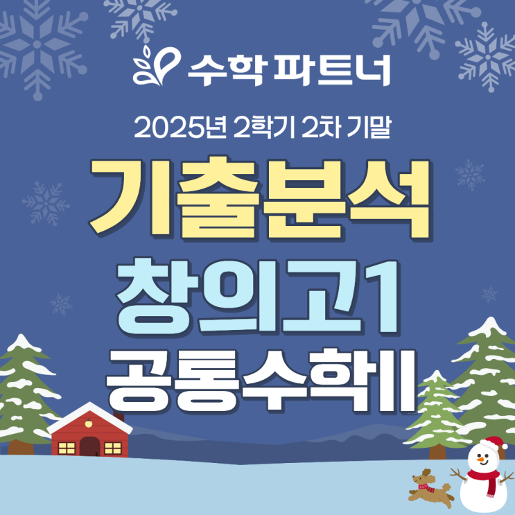안녕하세요 수학파트너학원 청계관입니다. 창의고등학교 1학년 2학기 기말 공통수학II 기출분석표 올려드립니다. 학생들의 학습방향 설정에 도움이 되시길 바랍니다. 출제 난이도는 '중상'수준입니다. 경향 분석 주어진 조건들을 이해하고, 이에 맞는 그래프를 그린 후, 문제에서 원하는 바를 구해야 하는 문제(선택형 18, 21, 22, 24번)들이 많았습니다. 논술형 없이 모두 선택형으로 출제되었으며, 문항 수가 많아 시간이 부족했었을 것으로 예상됩니다. 선택형 19번 문제오류로 시험시간이 5분 더 추가되었습니다. 전체적 총평 1등급 컷 68.5점, 2등급 컷 55.1점, 3등급 컷 36.5점 입니다. 쉬운 문항부터 소수의 어려운 문항까지 고....... <img src="https://blogthumb.pstatic.net/MjAyNTEyMjNfMjg3/MDAxNzY2NDg0NDkwNjk4.l7JYtUFYArPfeSnJGqTk_2Cglg0lZKT6KDDAbbuYpMEg.Osj7VVVDYlCeOlA0nemjW0vB_ThluaO4WLryA-c9F-og.PNG/%C1%A6%B8%F1%C0%BB_%C0%D4%B7%C2%C7%D8%C1%D6%BC%BC%BF%E4._%2810%29.png?type=s3" />