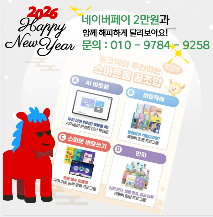 2026 새해, 네이버페이 2만원과 함께 시작하는 스마트 학습 2026년 새해, 아이 학습을 고민하셨다면 지금이 가장 좋은 타이밍입니다. 웅진씽크빅이 준비한 네이버페이 2만원 혜택과 함께 우리 아이에게 꼭 맞는 스마트 학습을 시작해보세요. 문의 : 010-9784-9258 씽크빅이 추천하는 스마트 올조합 학습 아이의 학습 고민, 한 가지만으로 해결되지 않습니다. 그래서 웅진씽크빅은 영역별 핵심 학습을 ‘올조합’으로 설계합니다. A. AI 바로셈 ✔ 우리 아이가 특히 취약한 부분을 분석 ✔ AI가 진단하고 완성하는 연산 학습 ✔ 수학의 기초 체력을 정확하게 잡아줍니다 B. 바로독해 ✔ 독해력 걱정이라면 필수 ✔ 독해를 잡아야 모든 과....... <img src="https://blogthumb.pstatic.net/MjAyNjAxMDdfMjIx/MDAxNzY3NzkxNTk4MDEx.zkKHnt-vhK1m7lk7XJFq4jWp0K4KfpQhRCkUtnH7ee4g.aPblA2eGL1SSRyh2dcH6LvdN1As8Gp6jF-pudpmswe4g.PNG/1767791554584.png?type=s3" />