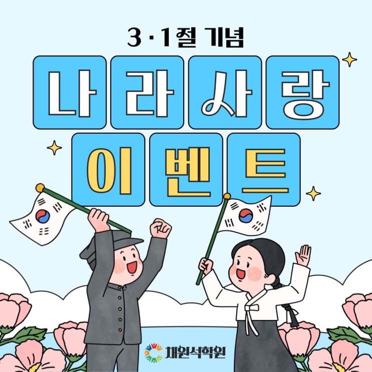안녕하세요! 채원석 학원입니다. 채원석학원에서는 3월 1일(일) 3·1절을 맞이하여 태극기 게양 인증 이벤트를 준비했습니다. 3·1절은 우리나라가 일본의 식민통치에 항거하고, 독립선언서를 발표하여 우리나라의 독립 의사를 세계 만방에 알린 날을 기념하는 날로, 우리나라의 5대 국경일 중 하나입니다. 이 날의 뜻을 높이기 위해 전국 모든 가정에 국기를 게양하고, 온 국민이 한 마음 한 뜻으로 축하하고 있습니다. 채원석학원 학생들에게도 3·1절의 의미를 제대로 알려주고자 태극기 게양 인증 이벤트를 진행합니다. 3·1절 당일에, 학생 얼굴이 나오는 태극기 게양 인증샷을 찍고, 아래의 번호로 문자를 보내주세요! 010-2330-2490 이벤트에....... <img src="https://blogthumb.pstatic.net/MjAyNjAyMjNfMjc0/MDAxNzcxODI1MjA2MjI3.KQGjhNHMLMHPOWzvLBcmosn-ayLzhKdUw5V2frf9Ia4g.zTcBZ2JMYBwiCruZjod69LI3kb7OuDz1yjGFMJuzL20g.PNG/001.png?type=s3" />