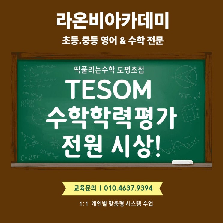 TESOM 수학학력평가 결과발표 – 전원 수상! 안녕하세요^^ 이번 TESOM 수학학력평가에서 우리 라온비아카데미 학생 3명이 응시했고, 전원 수상이라는 놀라운 성과를 이루었습니다. 최우수상 2명 : 도평초 5학년 안*윤 / 이*율 우수상 1명 : 도평초 3학년 정*슬 (수상자 정보는 개인정보를 위해 모자이크 처리하였습니다) 학생 개개인이 꾸준히 노력해온 결과가 이렇게 멋진 결실로 이어져 정말 뿌듯합니다. 심지어 감기로 인해 좋지 않은 컨디션으로도 최선을 다해 시험을 치렀던 3학년 친구도 특히 기억에 남아요. TESOM 수학학력평가는 어떤 시험인가? TESOM 수학학력평가는 학생들의 개념 이해도, 문제 해결력, 사고력 및....... <img src="https://blogthumb.pstatic.net/MjAyNTEyMTJfMTYy/MDAxNzY1NTMzNDA1ODE0.6ydbs3ncROCK2sg0VK47wEvxMOLB94ktkQFvrS0KUVog.P3hqzTQ4Z_okfCyZi1jKX9YnLqFTz_9dsf2LRd9A0-gg.JPEG/%C1%A6%B8%F1%C0%BB_%C0%D4%B7%C2%C7%D8%C1%D6%BC%BC%BF%E4._%283%29.jpg?type=s3" />